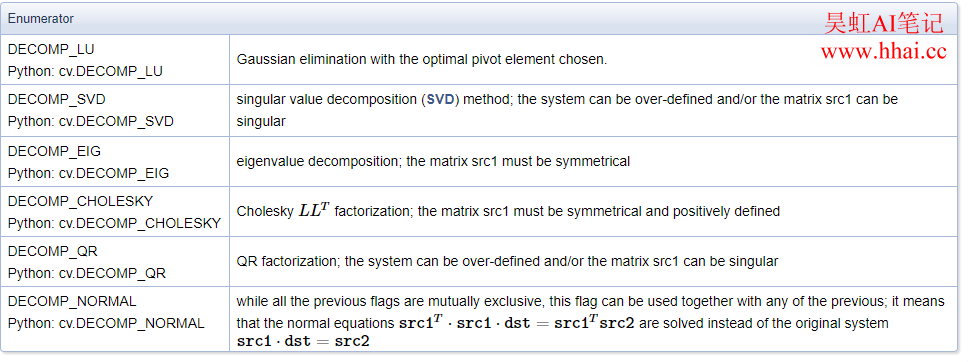 solveMethod—选择计算透视变换矩阵的方法,默认值为DECOMP_LU,其枚举值有如下这些: