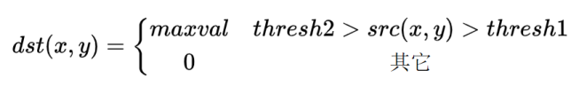 所谓双阈值化是指对于两个阈值thresh1<thresh2,将大于thresh1且小于thresh2的灰度值设定为maxval,其余的灰度值设为0。